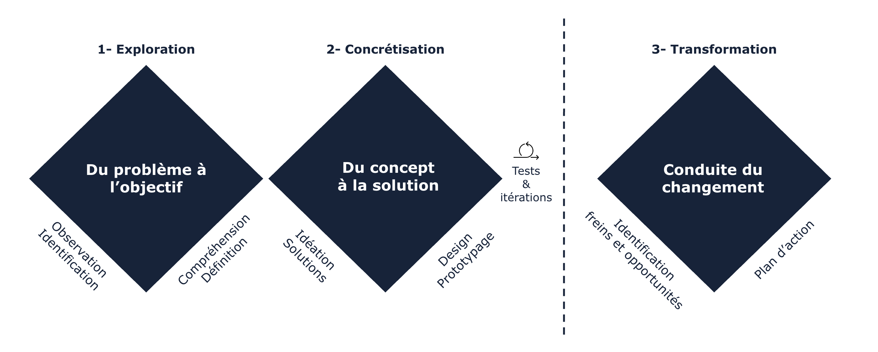 Mon accompagnement repose sur une démarche en trois temps, inspirée du design thinking et enrichie par le coaching et le conseil. Elle permet d’ancrer les transformations dans la durée tout en respectant les dynamiques humaines.